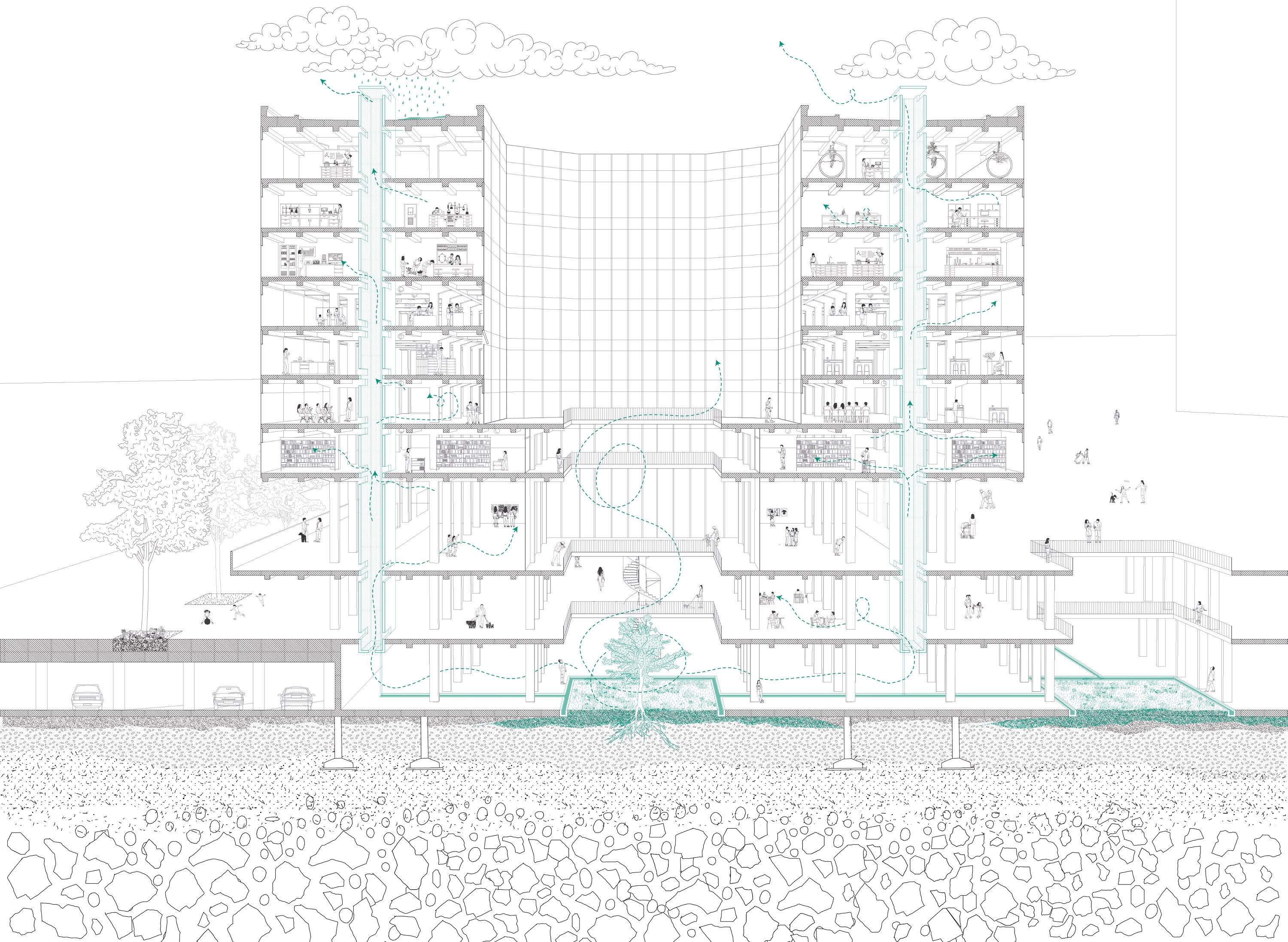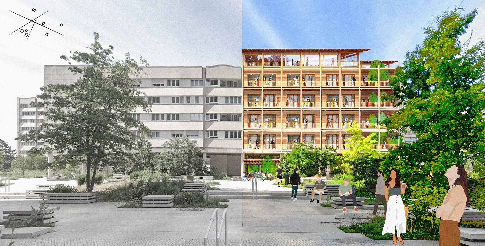 Ensuite, le « Prix Coup de cœur des internautes », qui vient gratifier le projet ayant reçu le plus grand nombre de votes de la part des collaborateurs de BNP Paribas Real Estate et internautes, a été attribué à Thierry Gedeon de l’ENSA Paris-Malaquais pour son projet « 7 bâtiments, 1 typologie : la cour centrale se réinvente ». Ce projet cherche à révéler un potentiel endormi, en se servant de la cour comme base pour une approche durable et revenant de ce fait à l’essence du patio. La revalorisation de ce lieu implique notamment l’ajout d’une canopée qui se glisse au pied du bâtiment et abrite des restaurants et cafés éphémères, déclenchant une nouvelle urbanité sur l’espace paysagé nouvellement rénové. Un exosquelette en bois vient se greffer sur le bâtiment et sa 5eme façade, élargissant les appartements, et offrant une possibilité de densification. L’identité du bâtiment change également ; les cloisons existantes sont substituées par de la terre crue. L’intervention sur cet existant doit être perçue comme un point de départ, pour réhabiliter par la suite, les autres bâtiments à proximité directe du site et ayant la même typologie que le bâtiment PH1 du quartier Boieldieu.