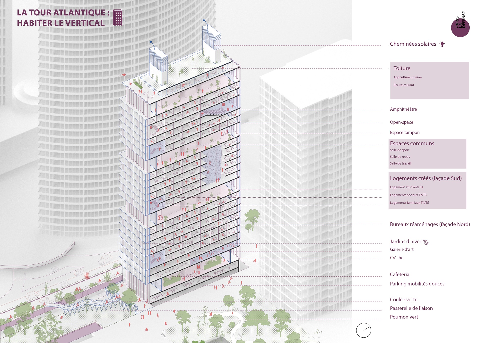 Enfin, le « Prix Spécial du Jury » a été décerné à Nicolas Goury et Adrien Gaillard, tous deux étudiants à l’EAV&T Paris Est, pour leur projet « Tour Atlantique : Habiter le vertical ». Ce-dernier s’étaye sur trois axes majeurs. Premièrement, la volonté d’en faire un élément charnière du territoire, tissant de nouveaux liens, encore trop inexistants, entre le parvis de la Défense et les zones résidentielles. Deuxièmement, la tour, jusqu’alors mono-programmatique tend à devenir un véritable lieu de rencontre en réinventant ses 35 000 m² de bureaux pour donner naissance à un quartier vertical vivant et polyvalent. En son sein seront alors accueillis résidents avec la création de logements, étudiants, sportifs, artistes, travailleurs, etc., dans leurs espaces dédiés ou dans les espaces communs mutualisés. Dernièrement, pour réaliser cette mutation, il est primordial pour la Tour de revoir ses performances énergétiques sous le prisme du low-tech. Par exemples, deux cheminées solaires ventileront naturellement la totalité des espaces de vie, tandis que les jardins d’hiver en façade Sud protègeront du froid hivernal et des surchauffes estivales. »