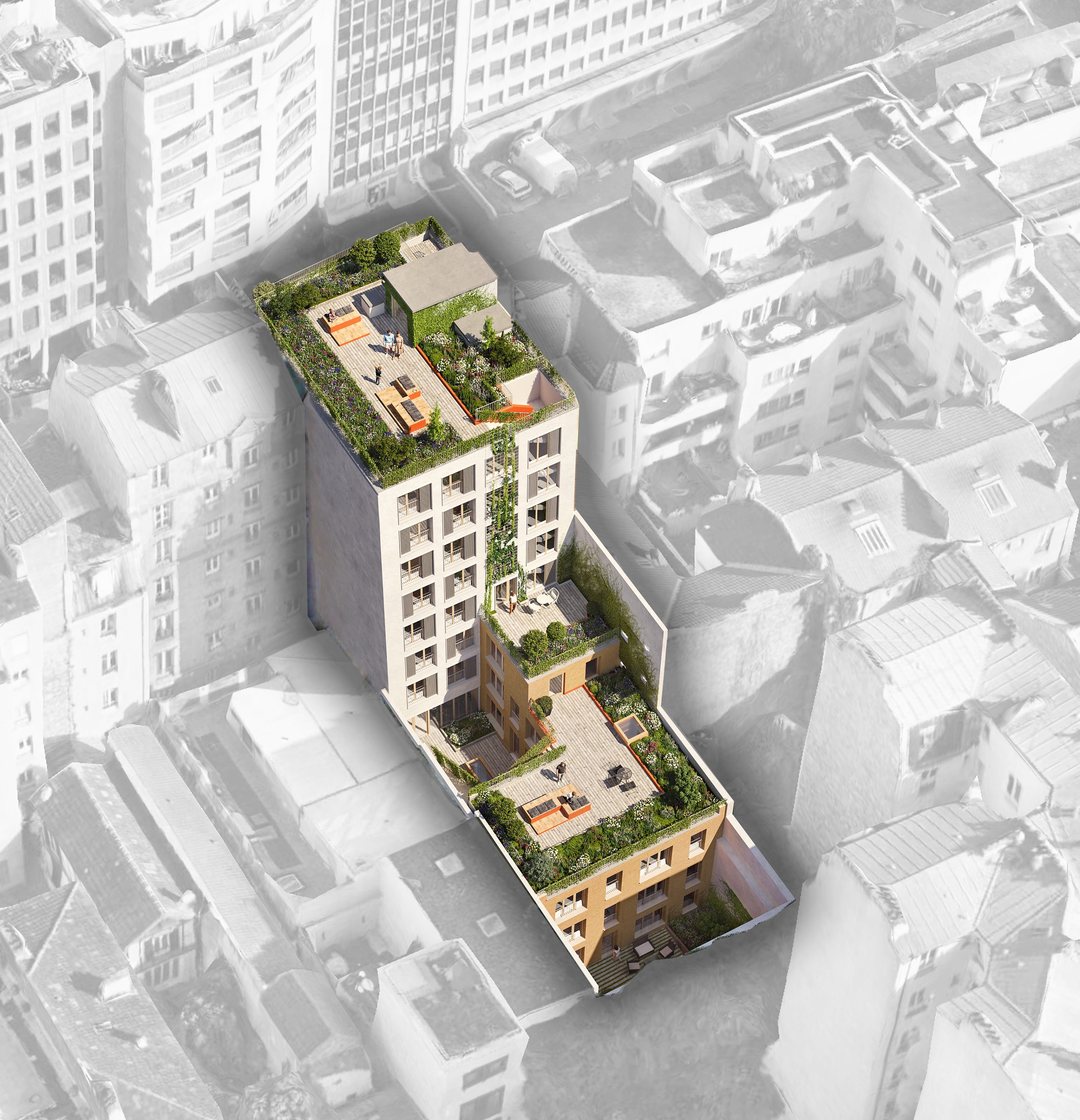 L’ensemble de ces espaces verts courant du toit au sous-sol, telle une cascade végétale, constituera une canopée. Par sa densité, elle participera à l’isolation thermique du bâtiment et luttera, à l’échelle de la parcelle, contre le phénomène d’îlot de chaleur urbain.