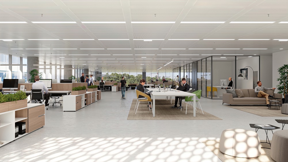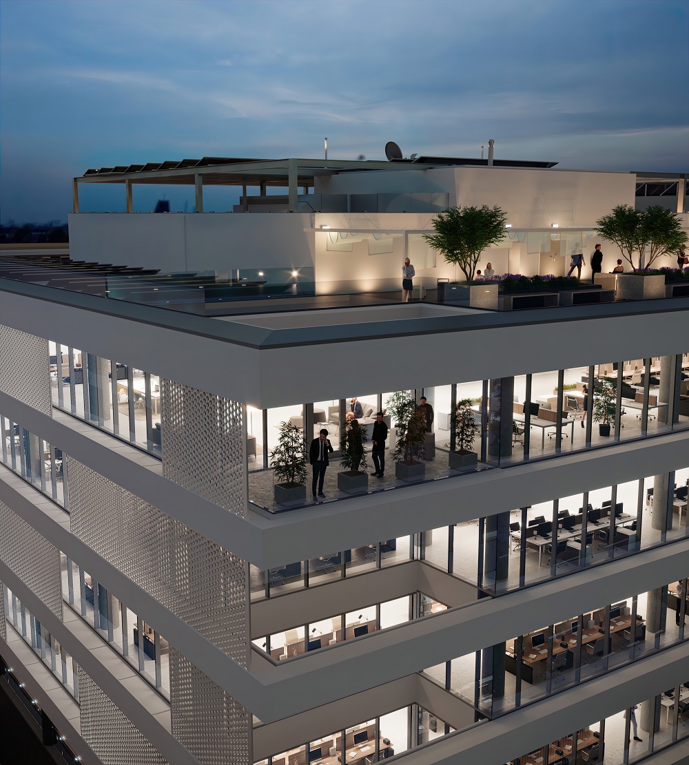 Les 5 étages de bureaux proposent un environnement de travail flexible, à la fois chic et confortable. Tout ici est conçu pour s’adapter aux nouveaux usages et favoriser le bien-être au travail des futurs occupants : des fenêtres toute hauteur offrent de beaux panoramas sur le nouveau quartier d’affaires international et permettent un apport maximal en lumière naturelle dont on sait qu’elle joue un rôle crucial pour l’équilibre physique et psychologique des utilisateurs.