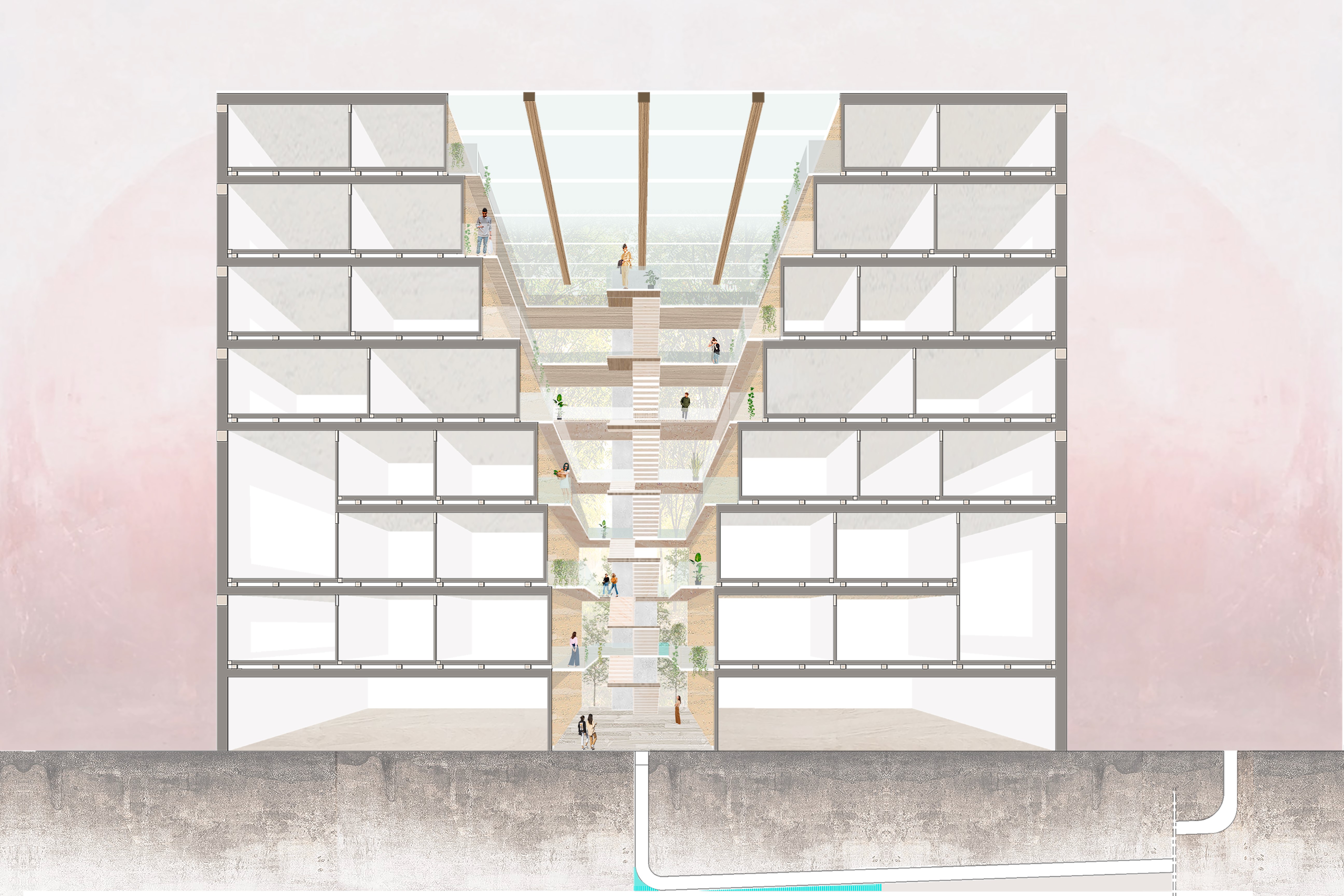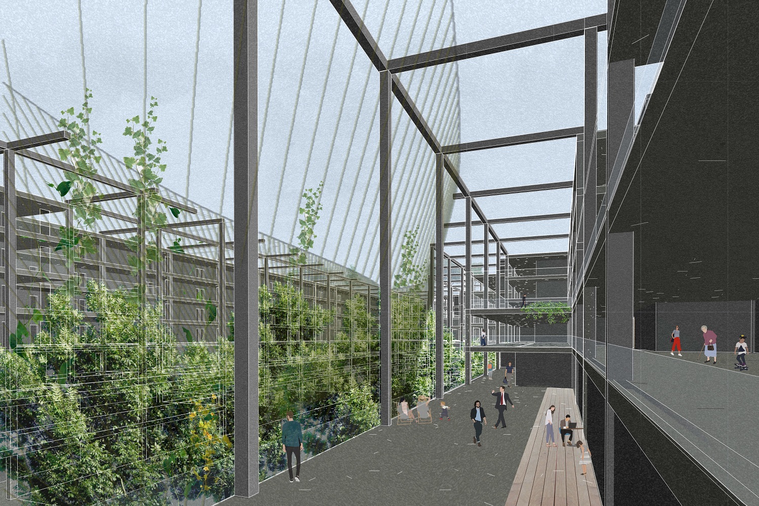 Le Jury a également décidé de décerner un deuxième Prix Spécial à Nina Pizzi, étudiante à l'EIVP - ENSA Paris La Villette, pour son projet audacieux. Ce concept offre de nouveaux usages aux édifices post-industriels afin de favoriser leur réappropriation fertile par les habitants. Basé au sein des entrepôts Ney situés dans le 18ème arrondissement de Paris, « La réappropriation fertile » permettrait de le rendre habitable pour d’autres usages et pourrait également redonner vie à la façade en lui apportant du relief et des balcons pour les habitants. Cet édifice industriel serait alors réappropriable par les parisiens au travers de programmes mixtes et flexibles, plus adaptés aux besoins de demain. En redonnant vie à des édifices voués à l'abandon, ce projet recrée un écosystème durable à l’échelle du bâtiment.