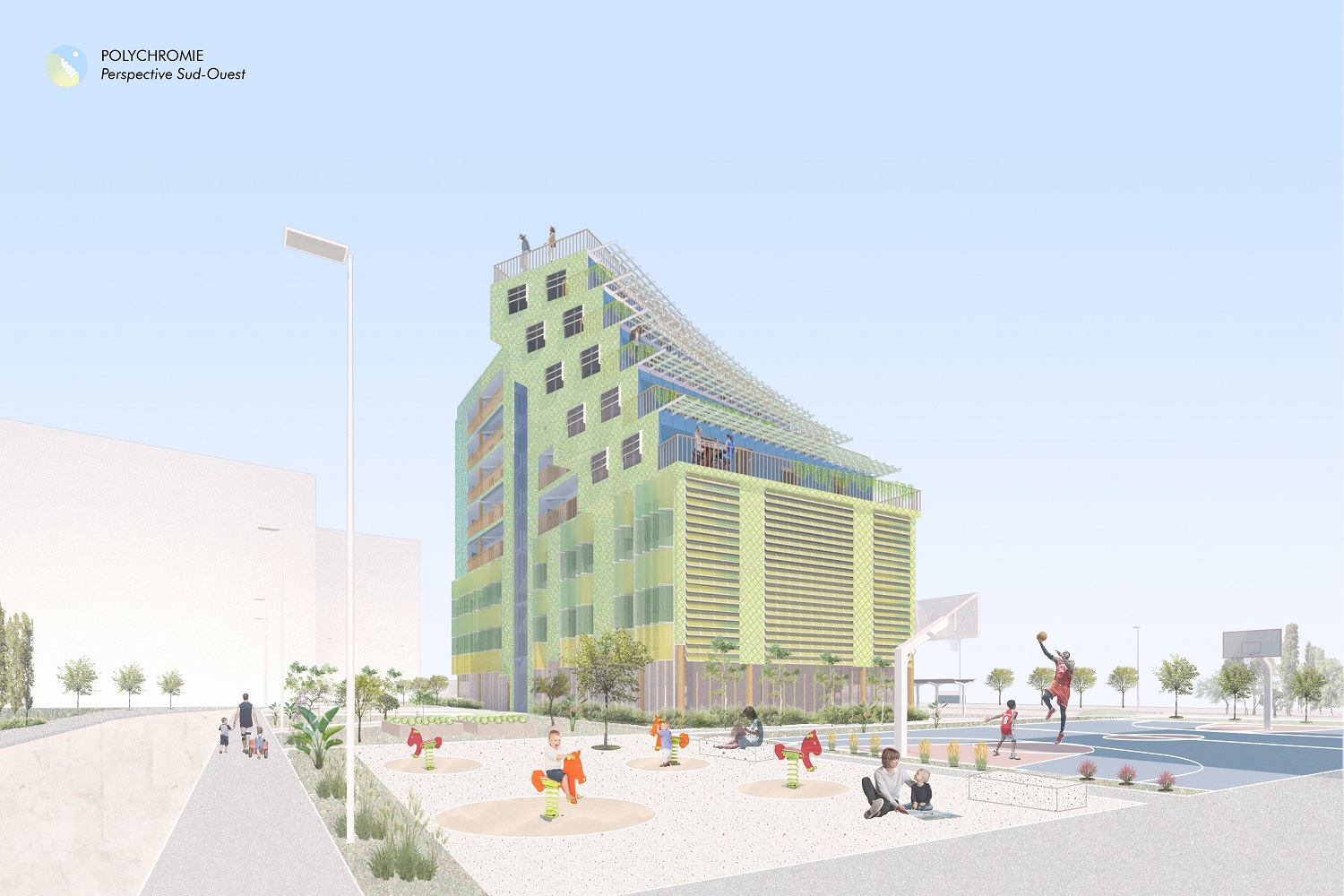Le Jury a décidé de décerner un premier Prix Spécial au projet « Polychromie » imaginé par Luka Forrester et Quentin Godiveau également étudiants à l’ENSA Paris Malaquais. Le jury a souhaité souligné le caractère innovant de leur proposition." Ce concept vient tirer parti des avantages de la couleur en tant qu’outil bioclimatique, inspiré du papillon morpho, et son effet sur les usagers. Inspiré des lames colorées de la Torre Agbar de Nouvel et la Métropole de Rouen de Ferrier, le bâtiment regroupe différents types de brise-soleil en verre dichroïque. Les lames de verre de couleur réfléchissante jaunes/verts filtrent ainsi la lumière aux plus grandes longueurs d’onde et mitigent les apports caloriques du soleil.