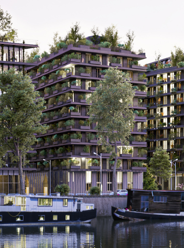 Pour le lot 3, l’agence d’architecture parisienne AAVP a imaginé un immeuble résidentiel de 6 400 m2 environ pour 88 logements neufs répartis en R+10. Ce projet affiche de fortes exigences environnementales : depuis les venelles situées de part et d’autre de l’immeuble et conçues comme des sous-bois en lien avec le parc adjacent, aux jardins privatifs des logements du RDC, en passant bien sûr par les balcons filants présents à chaque étage et par un toit végétalisé accessible aux résidents. On retrouve également 2 serres agricoles où les habitants profiteront d’un espace de convivialité pour se reconnecter à la nature.