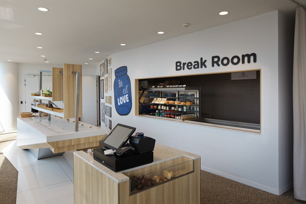 Une petite faim après cette séance sportive intense ? À mi-chemin entre espace de restauration et espace de respiration, un espace de pause appelé la « break room » offre des produits frais et bio, et est ouvert tous les jours de 11 heures à 15 heures. Il permet aux utilisateurs de CBX souhaitant déjeuner sur le pouce, de savourer un encas frais et gourmand tout en admirant la vue imprenable.