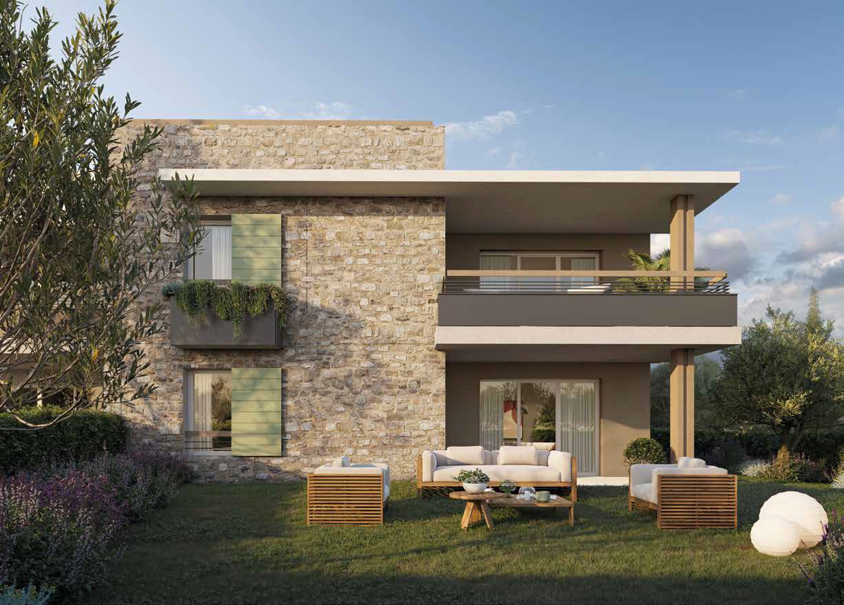 À l’extérieur, l’architecture emprunte au vocabulaire des bastides et mêle la pierre aux enduits gris clair, beige, blanc cassé et marron. Les teintes plus vives des volets battants et des toitures à quatre pentes parées de tuiles orangées viennent quant à elles conforter le caractère provençal de cette superbe réalisation immobilière.
