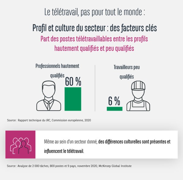 seulement 25% des employés européens auraient vu leur activité entièrement réorganisée en télétravail durant la pandémie. En revanche 10% des entreprises ont fermé, 21% ont été référencées comme non essentielles, 18% ont vu leur activité réduite, et 26% ont été référencées essentielles et sont restées totalement actives durant les confinements.