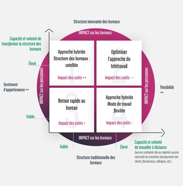 En ce qui concerne l’immobilier et les modes de transports en entreprises, les quatre scénarii mis en évidence par l’étude de BNP Paribas Real Estate et Arval, dépendent de nombreux facteurs, et annoncent de ce fait différents résultats. Des décisions qui seront prises par les organisations au cas par cas en fonction de leurs contraintes, objectifs et en consultation avec leurs collaborateurs.