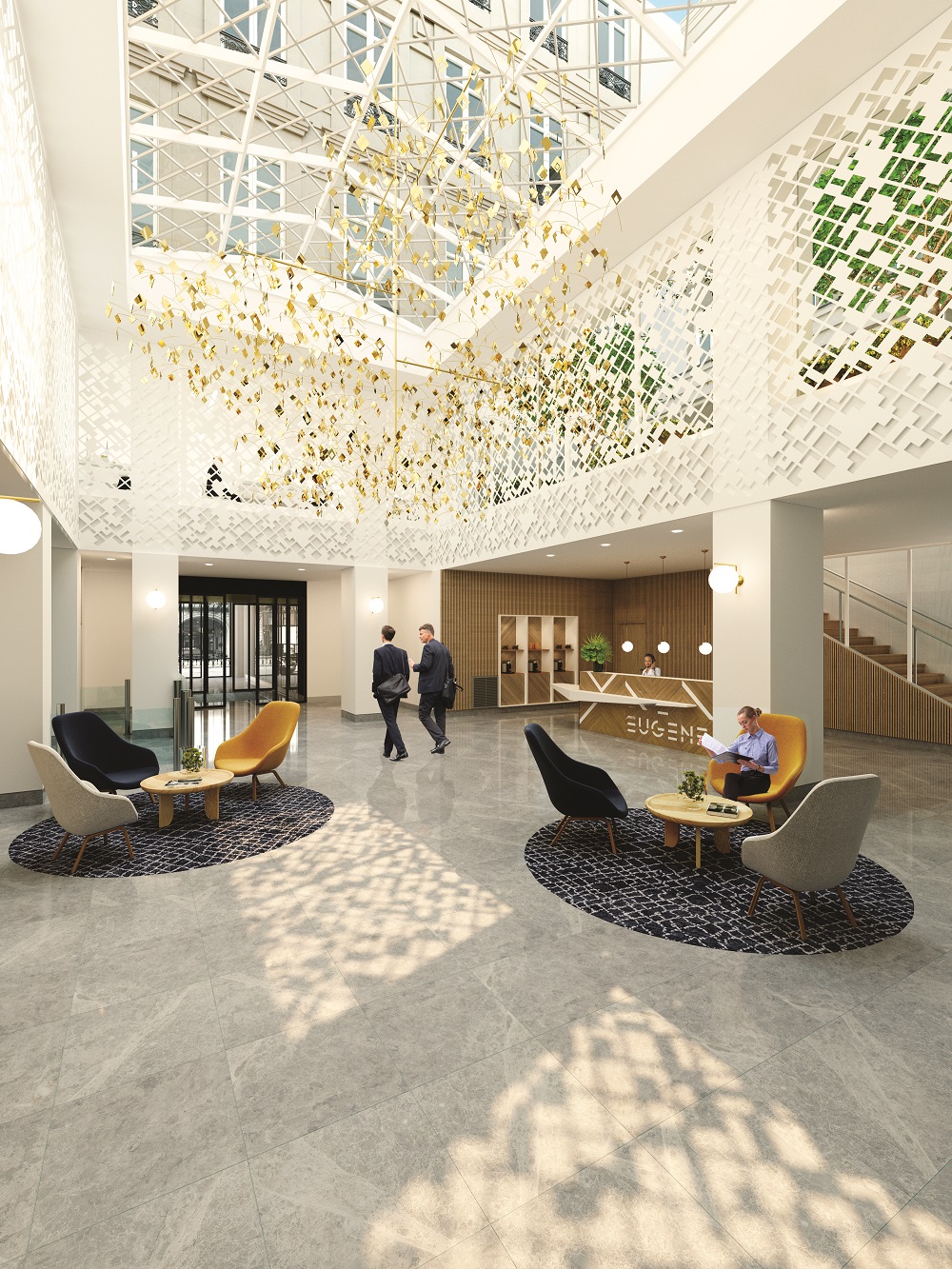 Le projet regorge d’autres idées très inspirantes. Je pense à cette terrasse paysagée, qui sera accessible depuis le hall et depuis les bureaux du premier étage. En surplombant le hall d’accueil, la terrasse en bois et ses plantations offriront une belle respiration aux lieux. Eugène dispose également de surfaces polyvalentes que l’on peut aménager en fonction des usages. L’architecte a réellement souhaité créer des lieux d’échanges et de contact pour encourager la collaboration. On retrouve également cette audace dans ces deux boîtes suspendues dans le vide, habillées de poli miroir et de verre, à l’arrière du bâtiment. Elles sont comme une extension des espaces de travail et proposent une sorte de parenthèse, un lieu qui s’intègre à la structure globale mais qui reste pourtant très intimiste. C’est à l’image du projet dans son ensemble.