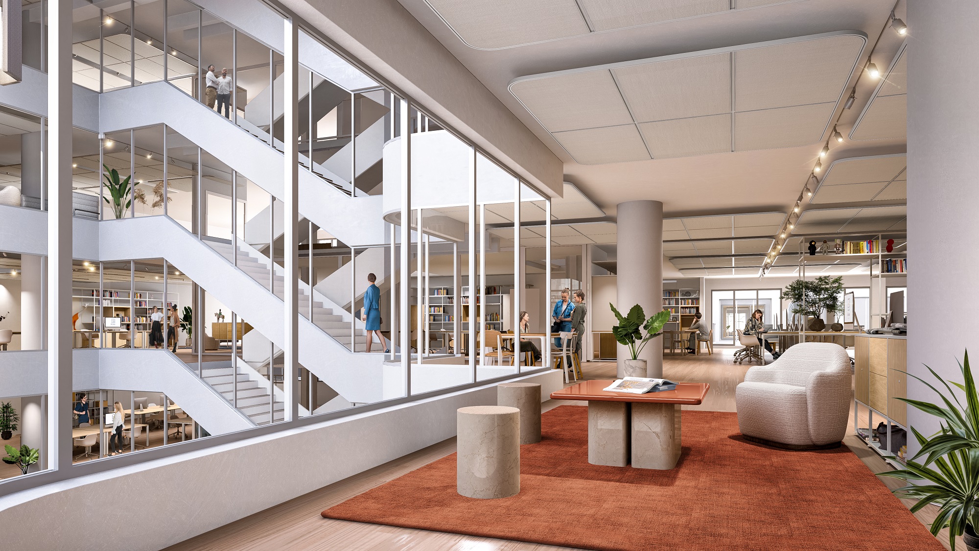 Une attention particulière est accordée aux circulations et à la distribution de la lumière entre les espaces. Chaque étage est rythmé de lieux de détente et de travail flexible. Il propose à chacun un lieu en phase avec son atmosphère et son tempo : espaces collaboratifs, espaces nomades, bureaux traditionnels et open spaces, ainsi que des espaces partagés.