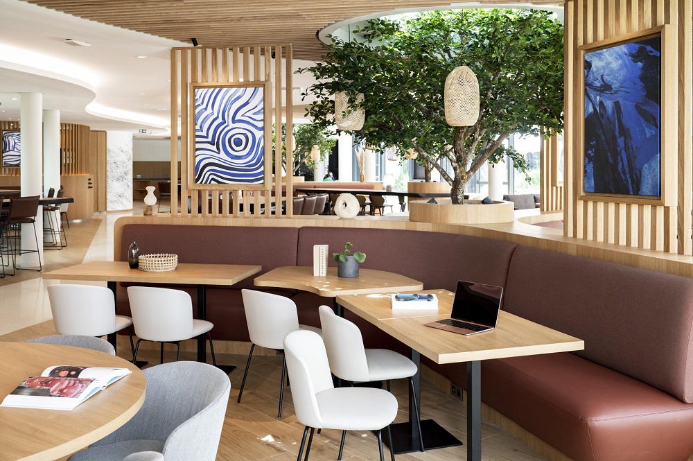 A l’intérieur, l’aménagement signé par l’architecte hôtelier Jean Philippe Nuel a été imaginé comme un lieu de vie chaleureux et haut de gamme grâce à des formes enveloppantes, des matériaux naturels et une lumière de premier jour maximisée.