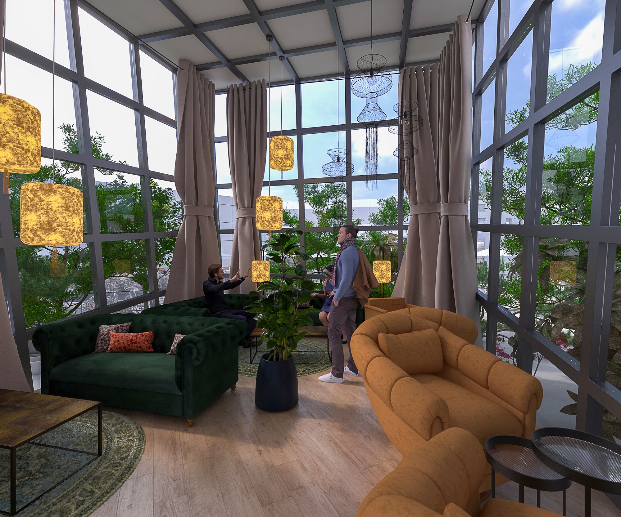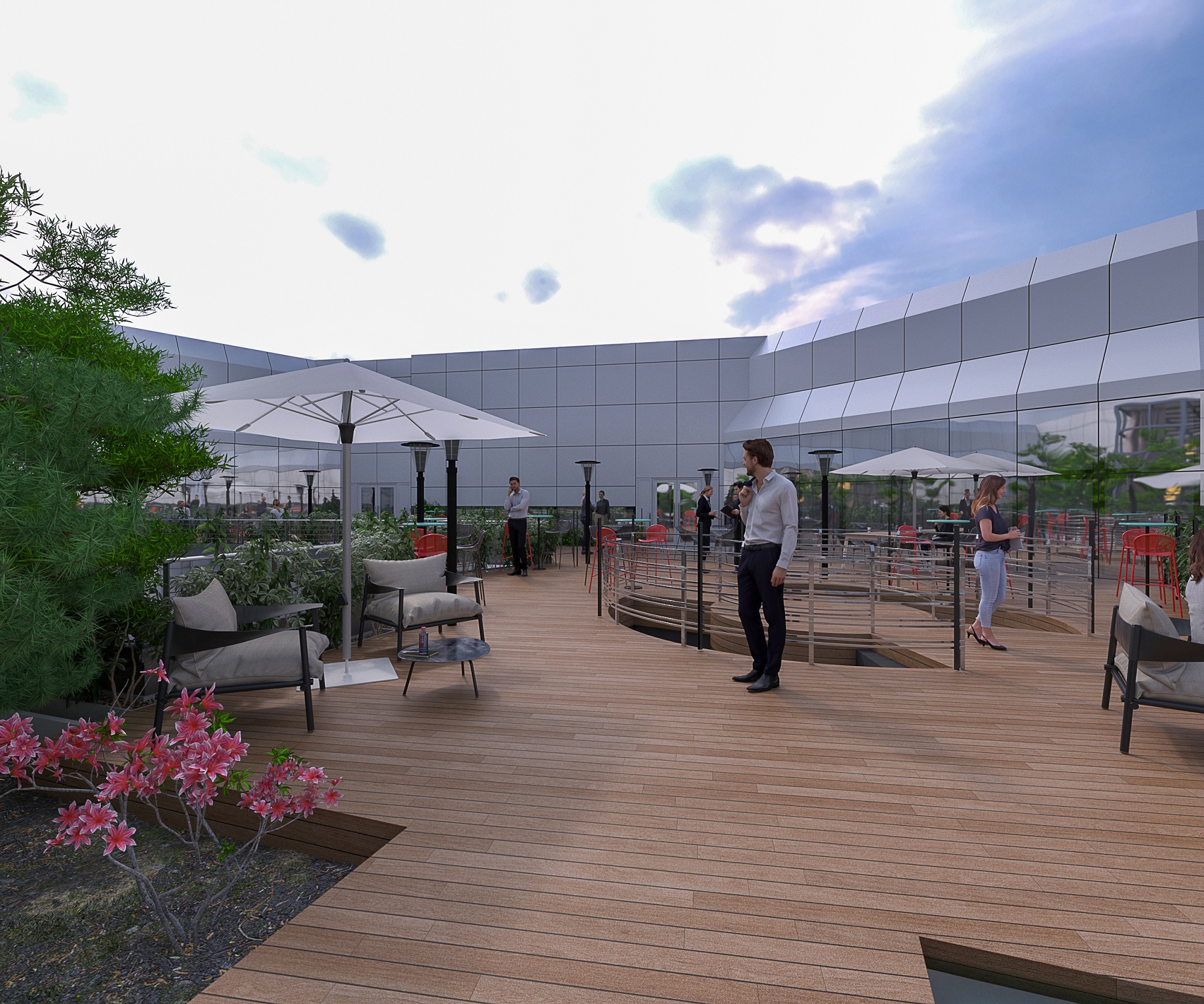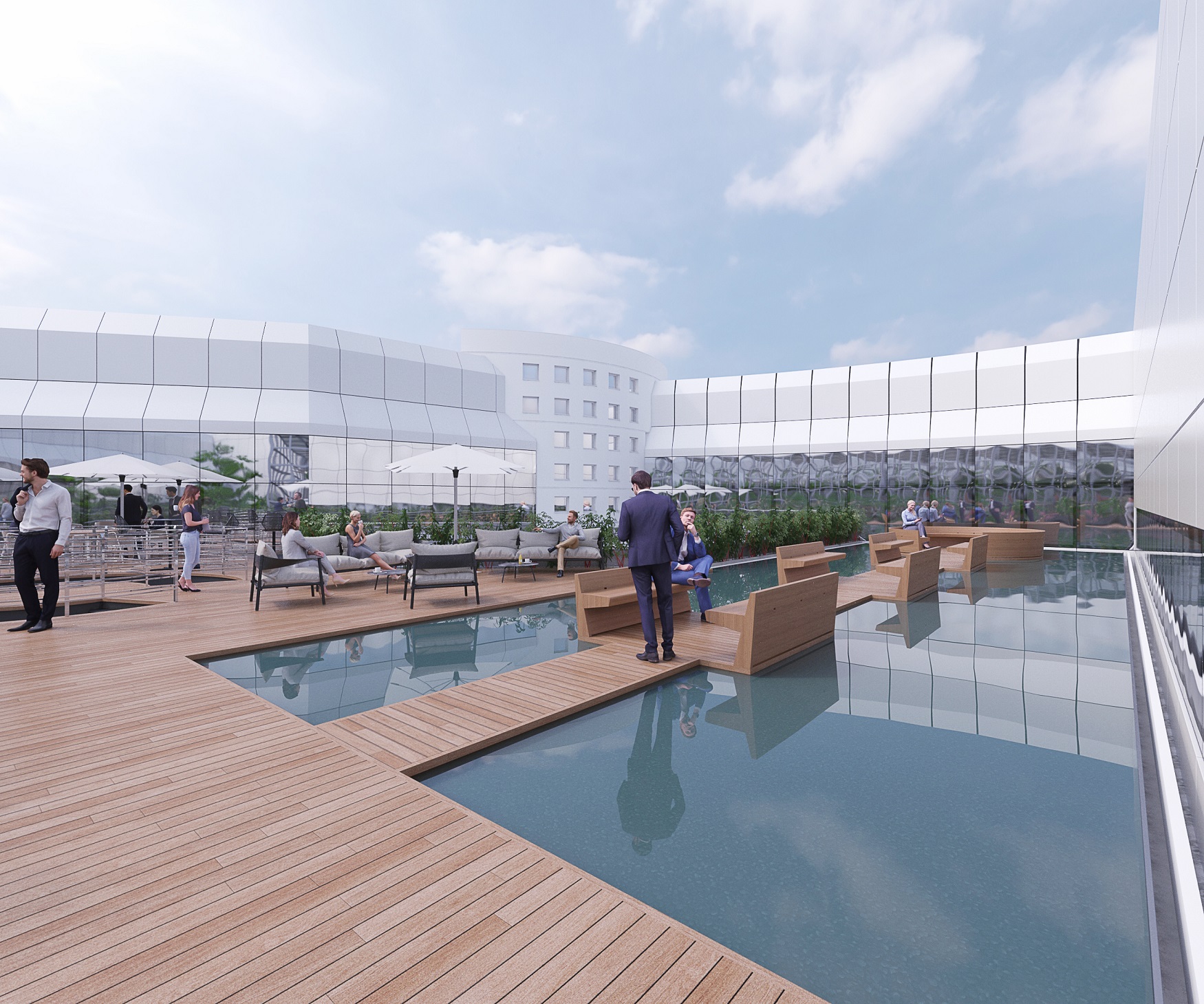 Abritée du vent et profitant de la fraîcheur naturelle des bassins, une allée avec des bancs prend place tout le long du bassin d’eau et permet aux utilisateurs de savourer un grand bol d’air. Un espace sous verrière déjà existant en immersion dans le roof top a été conservé pour en faire un jardin d’hiver. Véritable écrin de quiétude, il permettra par tous les temps de profiter d’un espace intimiste rempli de lumière naturelle et avec vue sur l’extérieur.