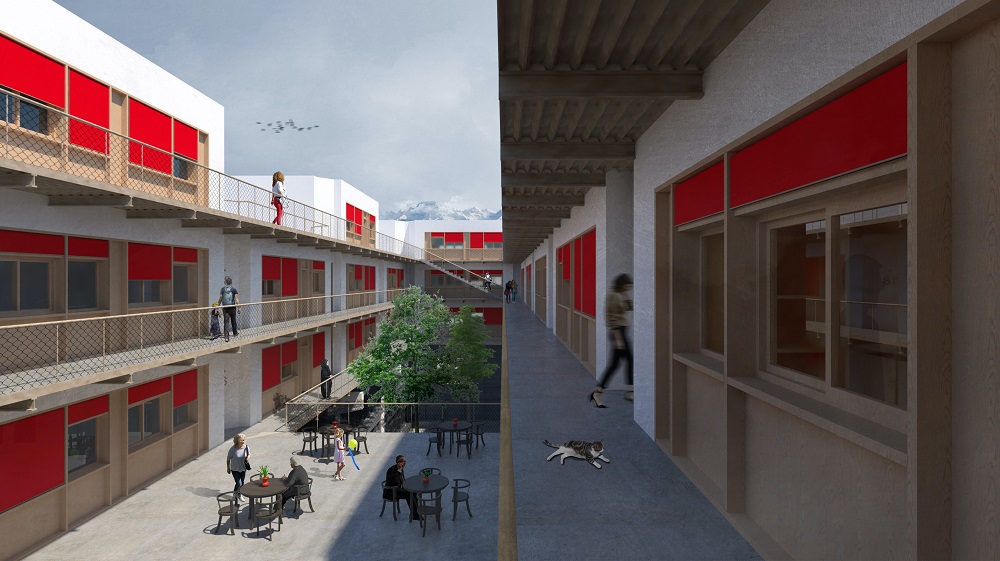 Le projet « La Ruche, Le Stratège » développé par Fabien Tonnard et Nicolas Alfaro est le deuxième projet qui remporte exæquo le Prix du jury. Ces étudiants en 5ème année à l’ENSA Grenoble offrent une nouvelle vie au bâtiment Stratège situé à Grenoble, et vivement critiqué par ses occupants. Pour sauver ce patrimoine, ces jeunes architectes souhaitent transformer le Stratège en une ruche urbaine au sein de laquelle serait proposée une pluralité d’activités. Le bâtiment, restructuré avec du bois pour minimiser son empreinte carbone, s’organise autour d’un patio central avec un rez-de-chaussée proposant un garage, des commerces de proximité, des bureaux et des niveaux supérieurs composés de logements. À travers les différents services proposés, ce lieu est propice à la rencontre et à la mixité intergénérationnelle et sociale entre les habitants, tout en offrant une bonne qualité de vie. Complètement ancré dans l’ambition de revitalisation urbaine, « La Ruche, Le Stratège » a su s’attirer les faveurs du jury, grâce à un projet qui s’implante naturellement dans le paysage urbain, permettant de connecter Grenoble à ses alentours.