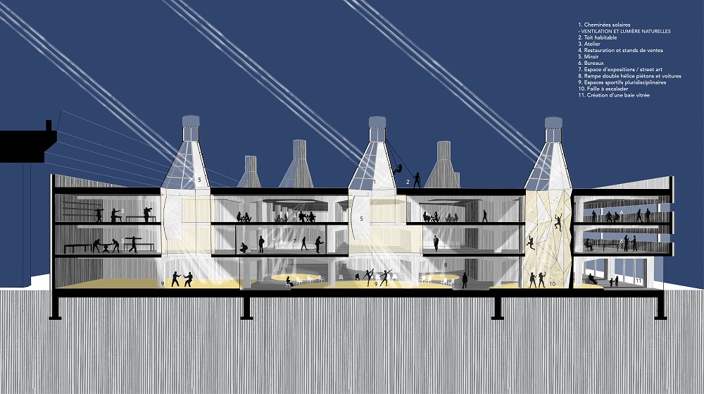Un premier Prix du jury exæquo est donc venu distinguer le travail de Jean Cappelle et Faïne Raisson, étudiants en 5ème année à l’ENSA Paris Malaquais, pour leur programme immobilier baptisé « Les Puits de la Ville ». Ce projet consiste en la réhabilitation d’un parking silo de près de 20 000 m² situé Porte de la Villette à Paris, qui est actuellement laissé à l’abandon. Grâce à un système de cheminées en verre qui percent le bâtiment, des puits de luminosité seraient ainsi créés pour baigner en lumière du jour ce large espace complètement plongé dans l’obscurité aujourd’hui. Ce système aurait même le double avantage de ventiler les lieux de façon naturelle. Tel qu’imaginé par ces deux talentueux étudiants, le site accueillerait de nombreux services : des espaces culturels avec des endroits dédiés aux expositions, à la danse ou au théâtre ; des lieux consacrés aux sports de combat, au yoga et à l’escalade, et même, des bureaux à l’étage. « Les Puits de la ville » a su séduire le jury grâce à un projet innovant et inclusif, qui rassemble la ville en faisant cohabiter dans le même lieu différents profils. Il a même fait coup double en remportant également le Prix coup de cœur des internautes, qui ont pu voter en ligne pour leur projet favori.
