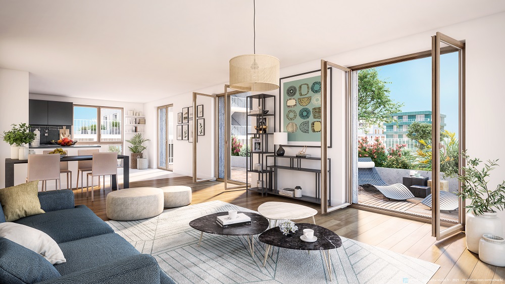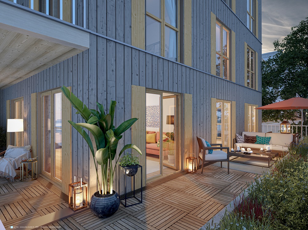 Depuis la rue, Upper esquisse 2 silhouettes contemporaines, habillées de bois et surmontées de terrasses qui pourront être productives (fruits et légumes), ludiques (accessibles aux résidents) ou bien dédiées à la biodiversité. L’on comprend immédiatement que tout ici est conçu au service d’un art de vivre au plus près de la nature. Déclinés du studio jusqu’au 5 pièces en duplex, les appartements de l’ensemble Upper sont tous traversants et déploient des volumes généreux dotés de grandes baies vitrées. La lumière qui entre ainsi dans les logements s’invite comme un véritable matériau d’aménagement pour ces espaces à vivre modulables dont la flexibilité permet de multiples configurations. Quant aux balcons, loggias et jardins privatifs, ils accueilleront aux beaux jours de jolis moments de convivialité en famille ou entre amis. Dans le même esprit, la résidence propose également des terrasses partagées et productives.