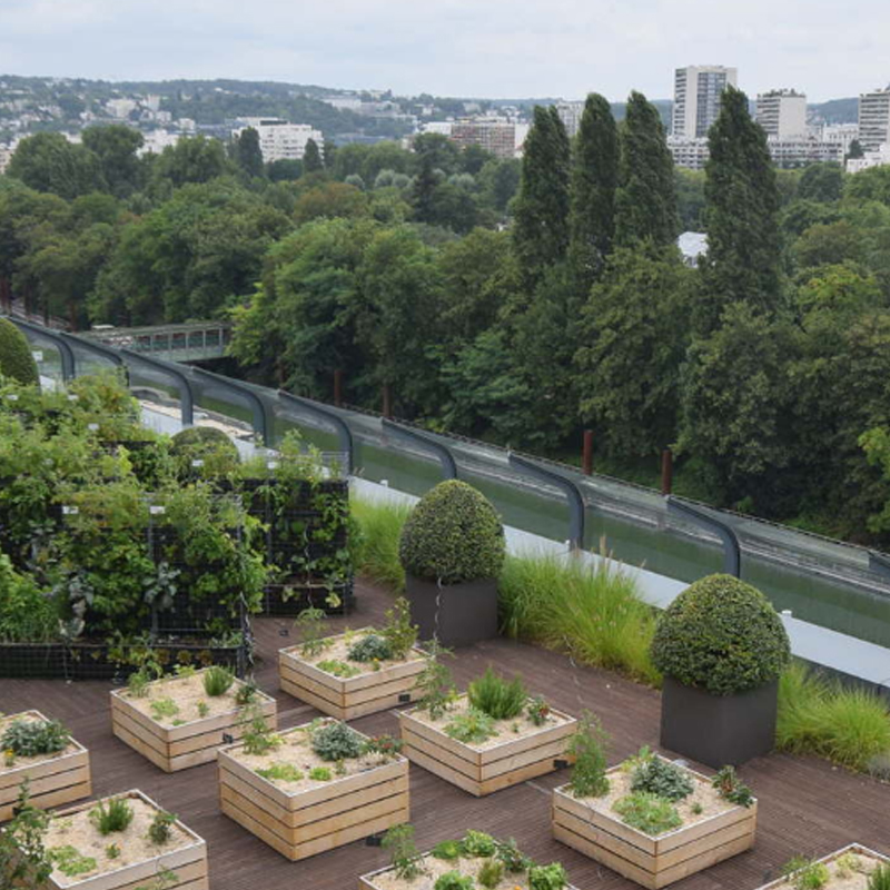 BNP Paribas Real Estate a transformé les toits-terrasses de son siège social, à Issy-les-Moulineaux, en ferme urbaine, pour favoriser le bien-être des collaborateurs, servir de démonstrateur pour les clients et de laboratoire expérimental pour la recherche agricole. Un projet développé en partenariat avec le paysagiste Mugo et la start up Peas&Love, qui loue des parcelles potagères. ©Veryhappymedia.