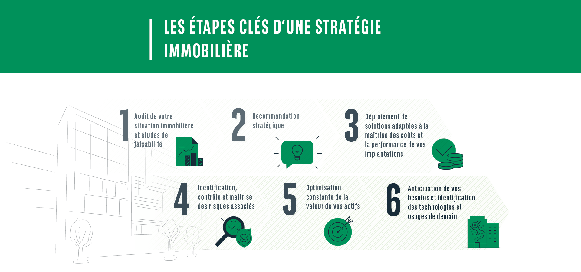 Nos équipes accompagnent les entreprises dans leurs grands projets immobiliers. Qu'il s'agisse d'un déménagement ou de la définition du schéma directeur immobilier, la stratégie immobilière est essentielle en termes de maîtrise des coûts, d'attractivité et de rétention des talents.